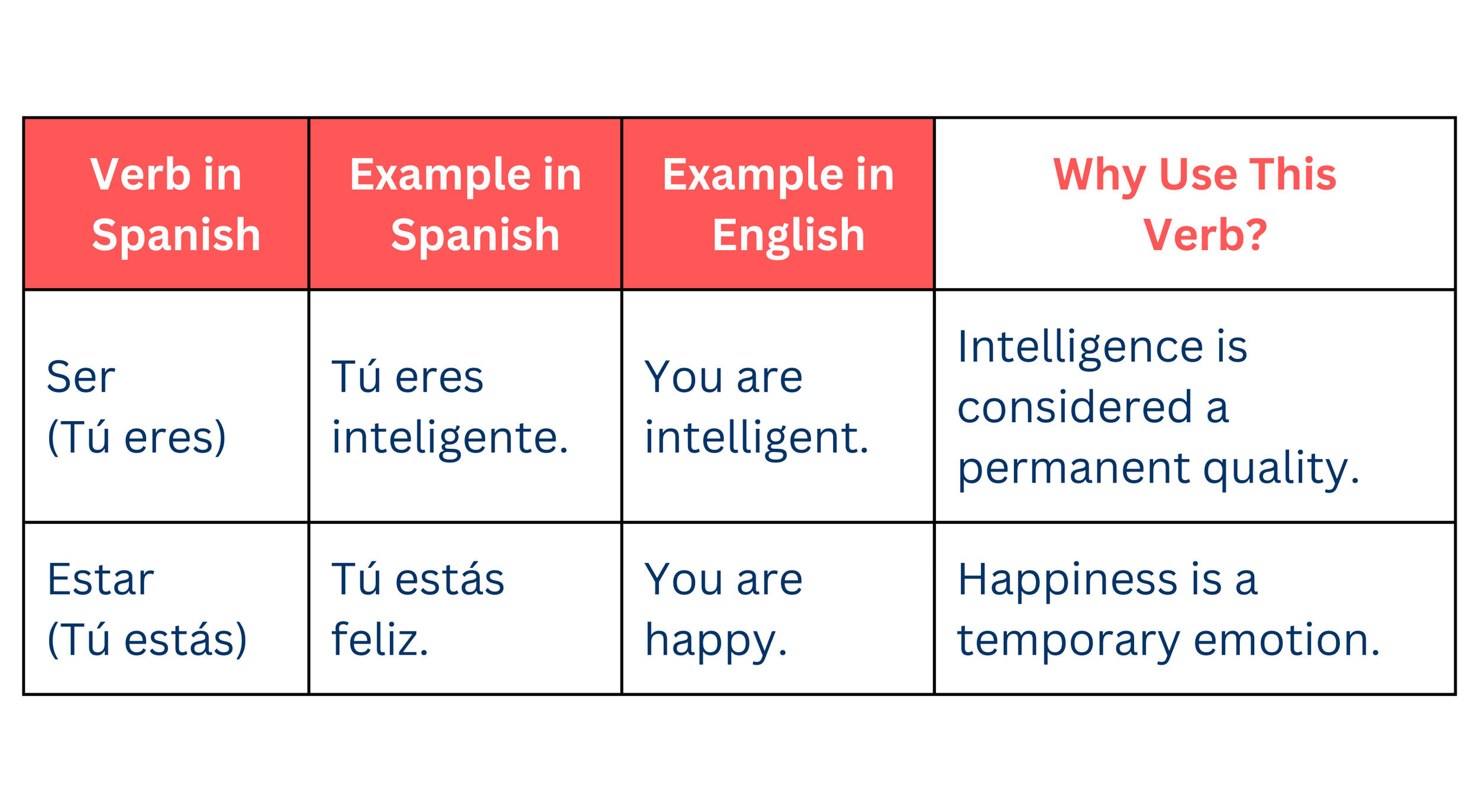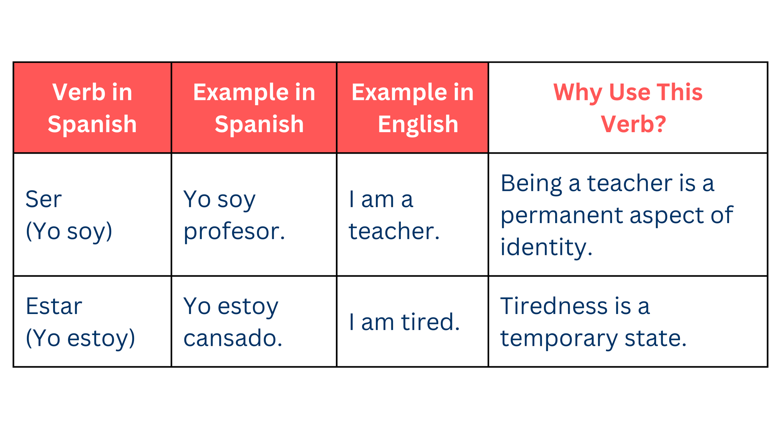 Now that we know the differences between "ser" and "estar," both meaning "to be" in English, let's take a moment to see how they match up with their English counterpart: